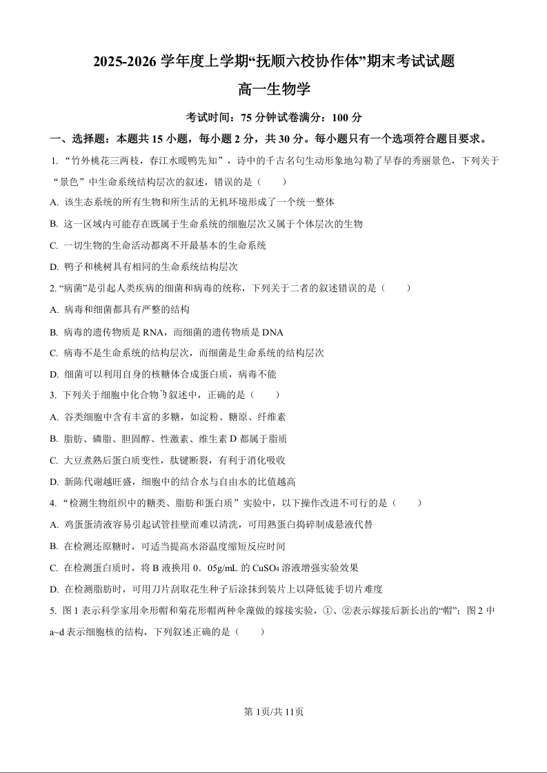 高一生物(原卷版)--辽宁省抚顺市六校协作体2025-2026学年高一上学期期末联考