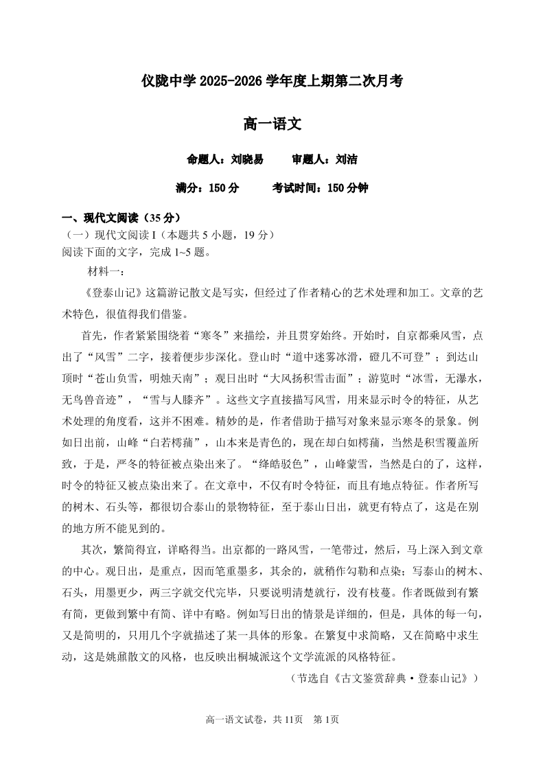 高一语文--四川省南充市仪陇中学2025-2026学年高一上学期12月月考