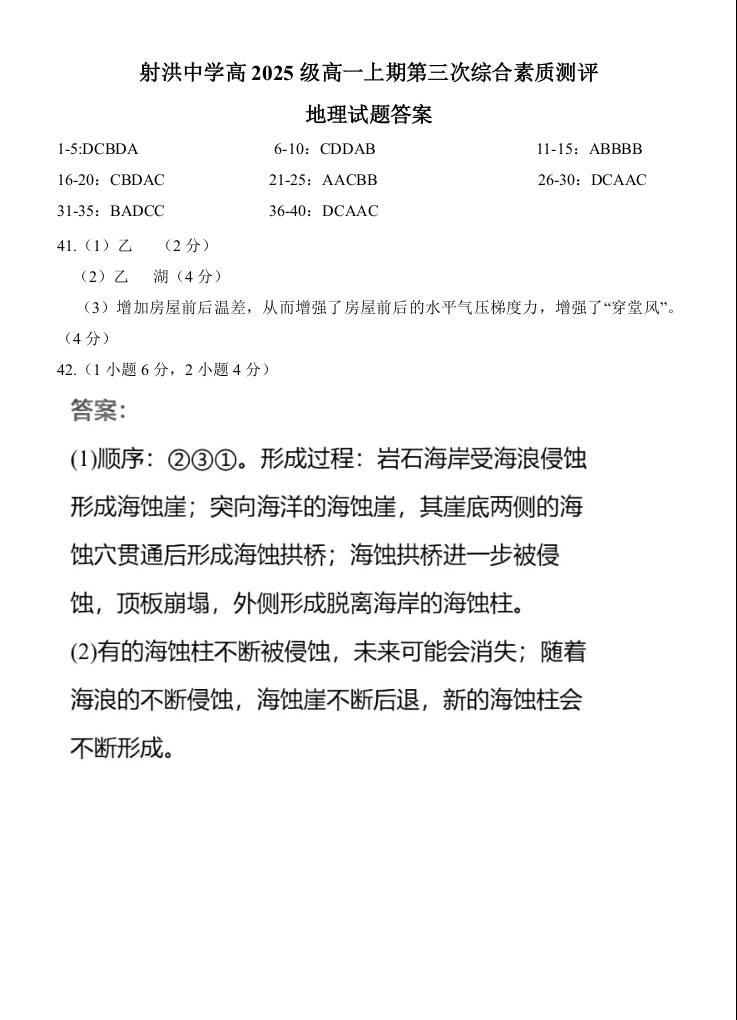 高一地理答案--四川省遂宁市射洪中学2025-2026学年高一上学期1月月考