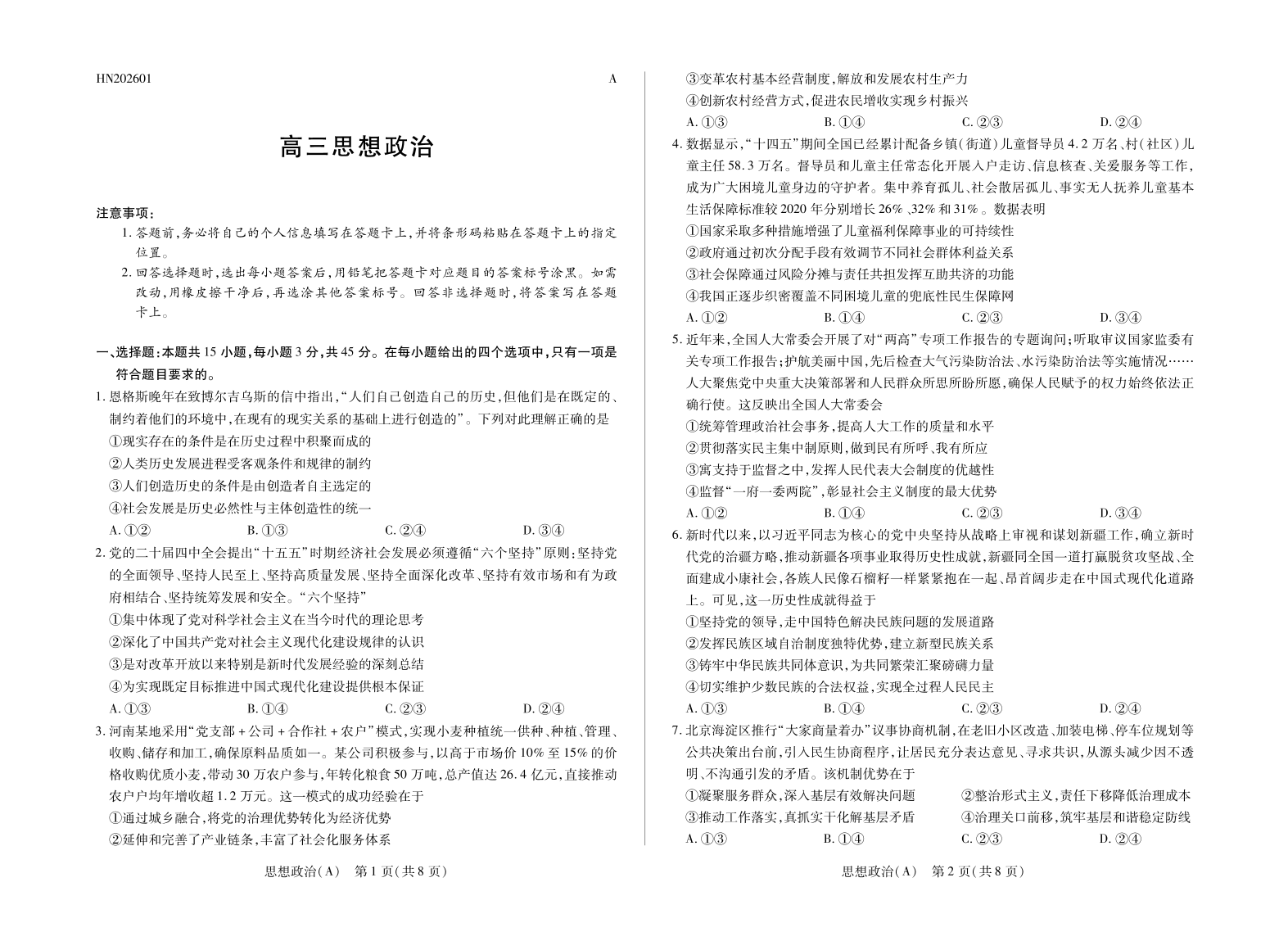 高三政治A--河南省多校小高考2026届高三上学期素质评价(三)
