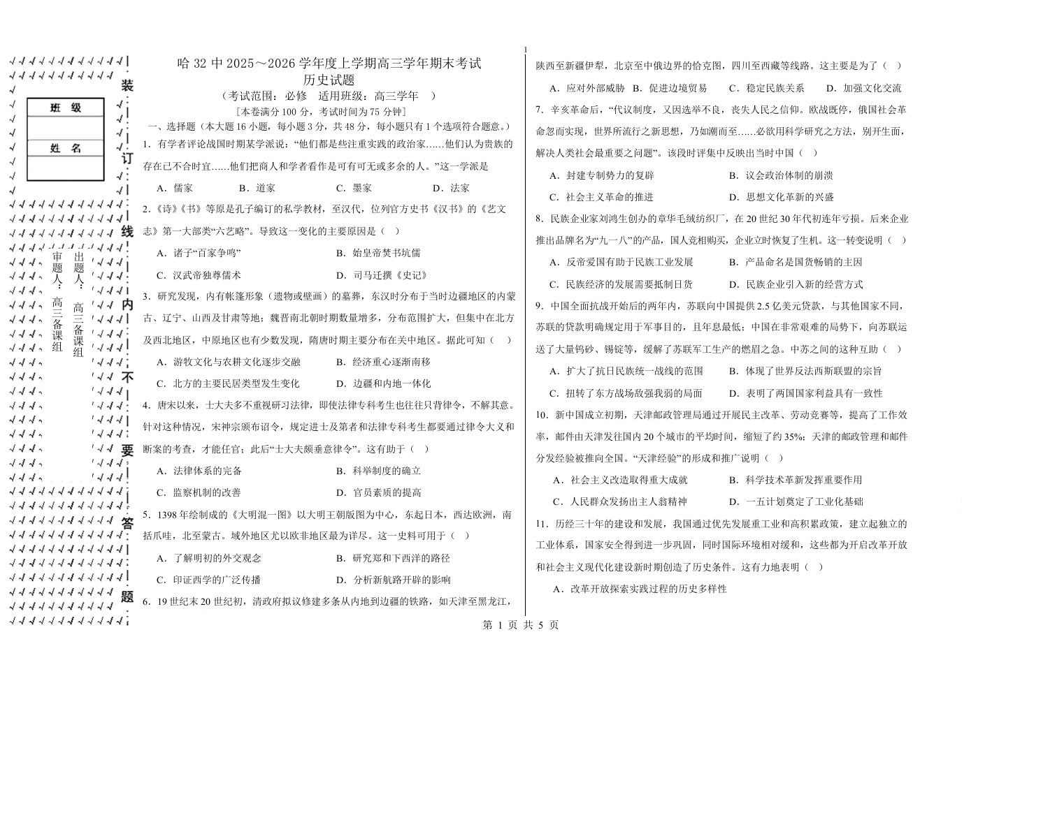 高三历史+答案--黑龙江省哈尔滨市第三十二中学校2026届高三上学期1月期末考试