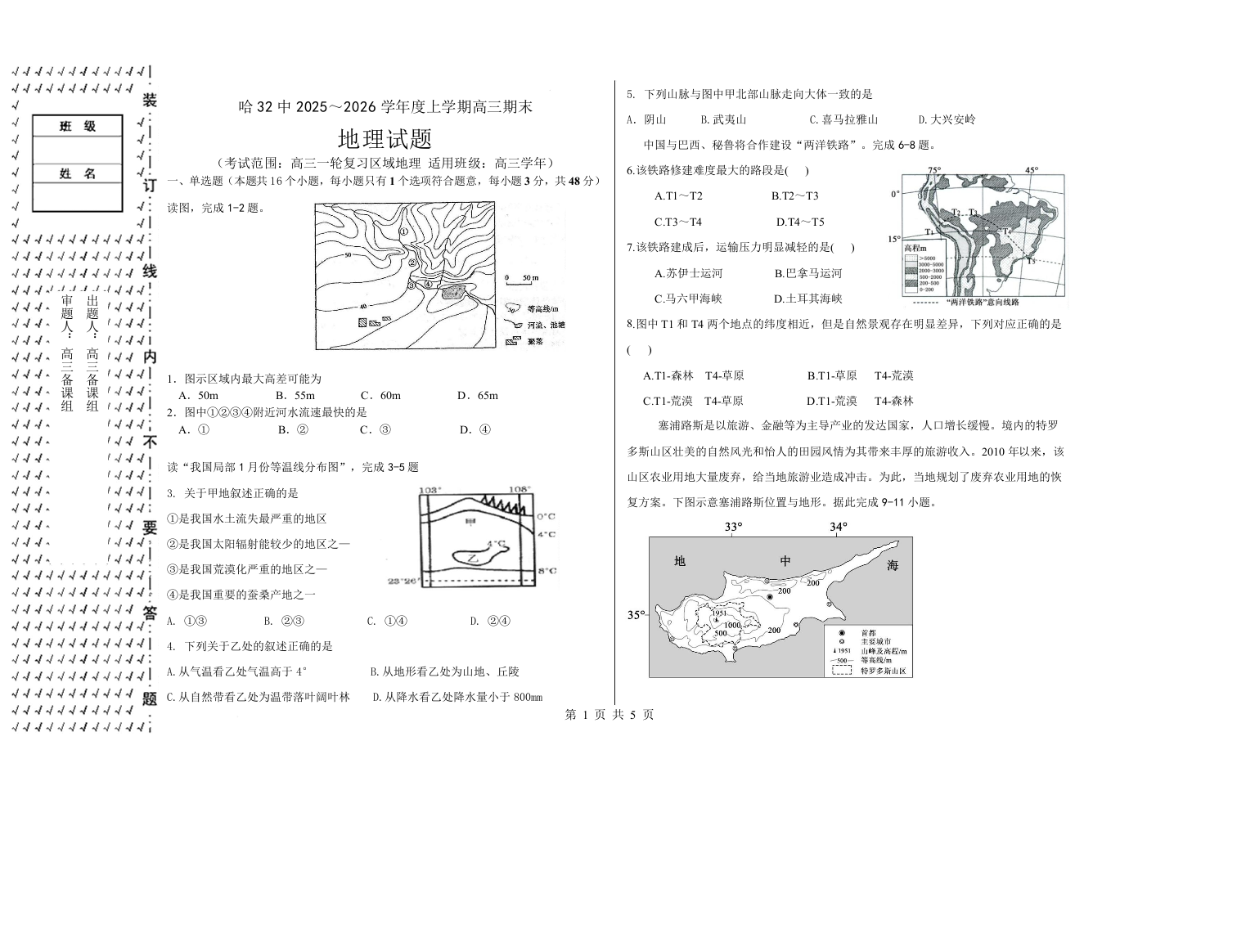 高三地理+答案--黑龙江省哈尔滨市第三十二中学校2026届高三上学期1月期末考试