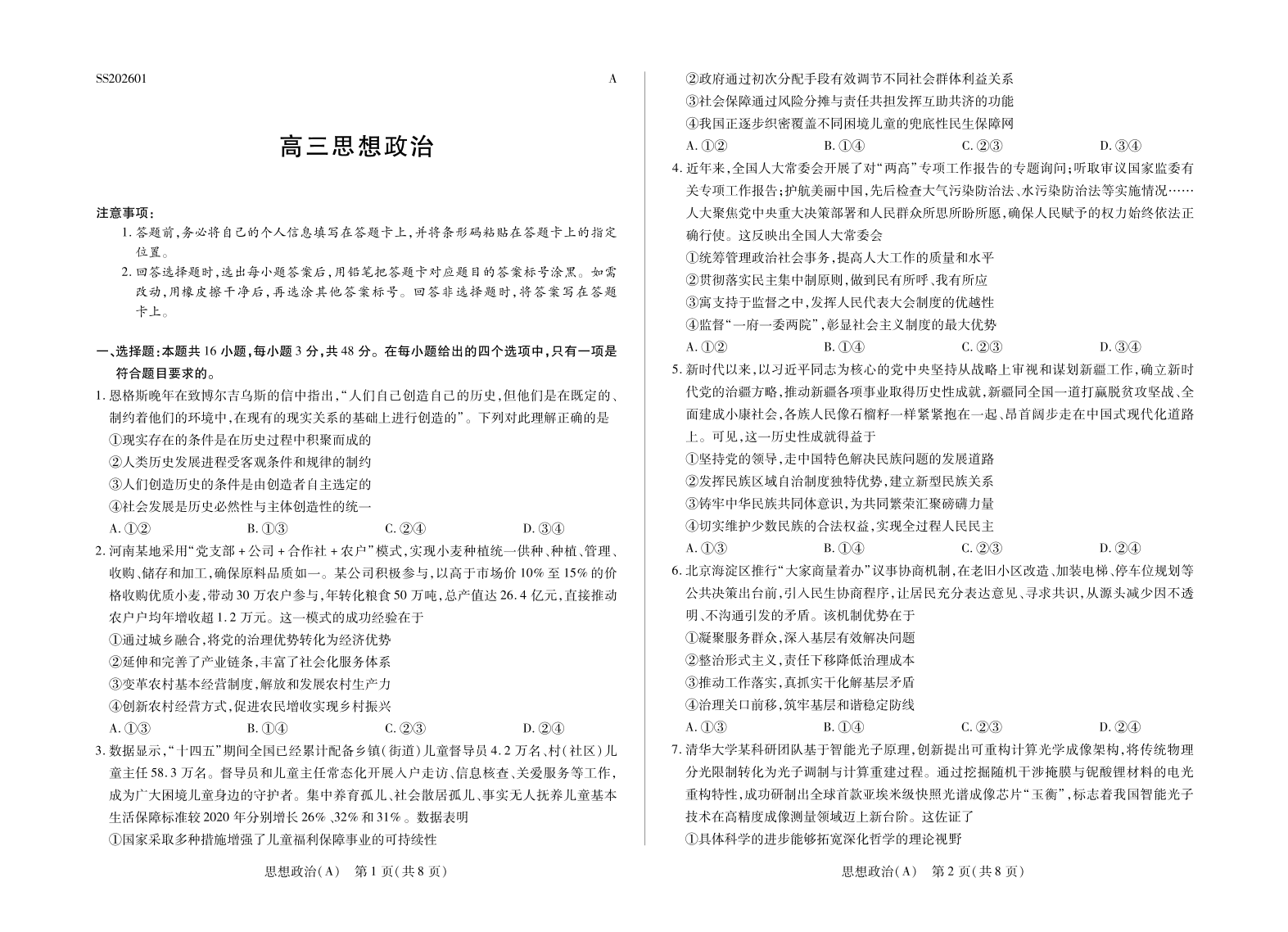 高三政治--陕西山西宁夏青海2026届高三学期1月四省联考