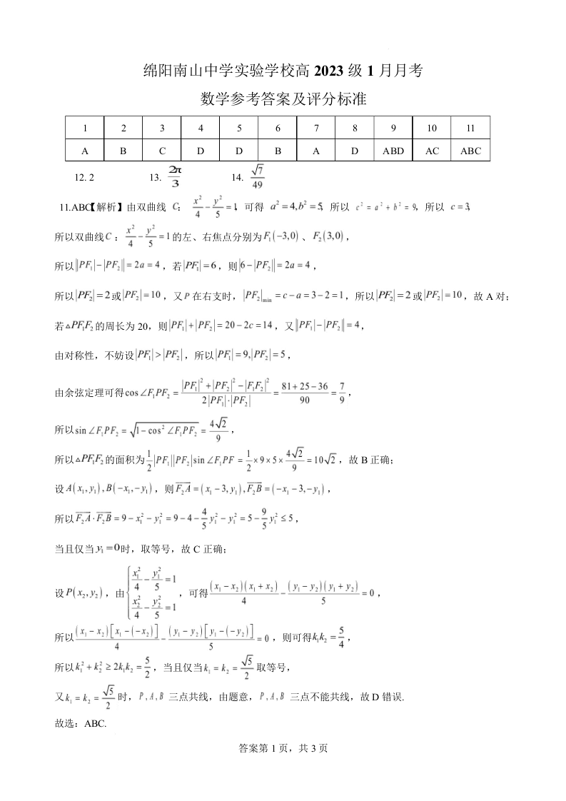 高三数学答案--四川省绵阳市南山中学实验学校2026届高三上学期1月月考