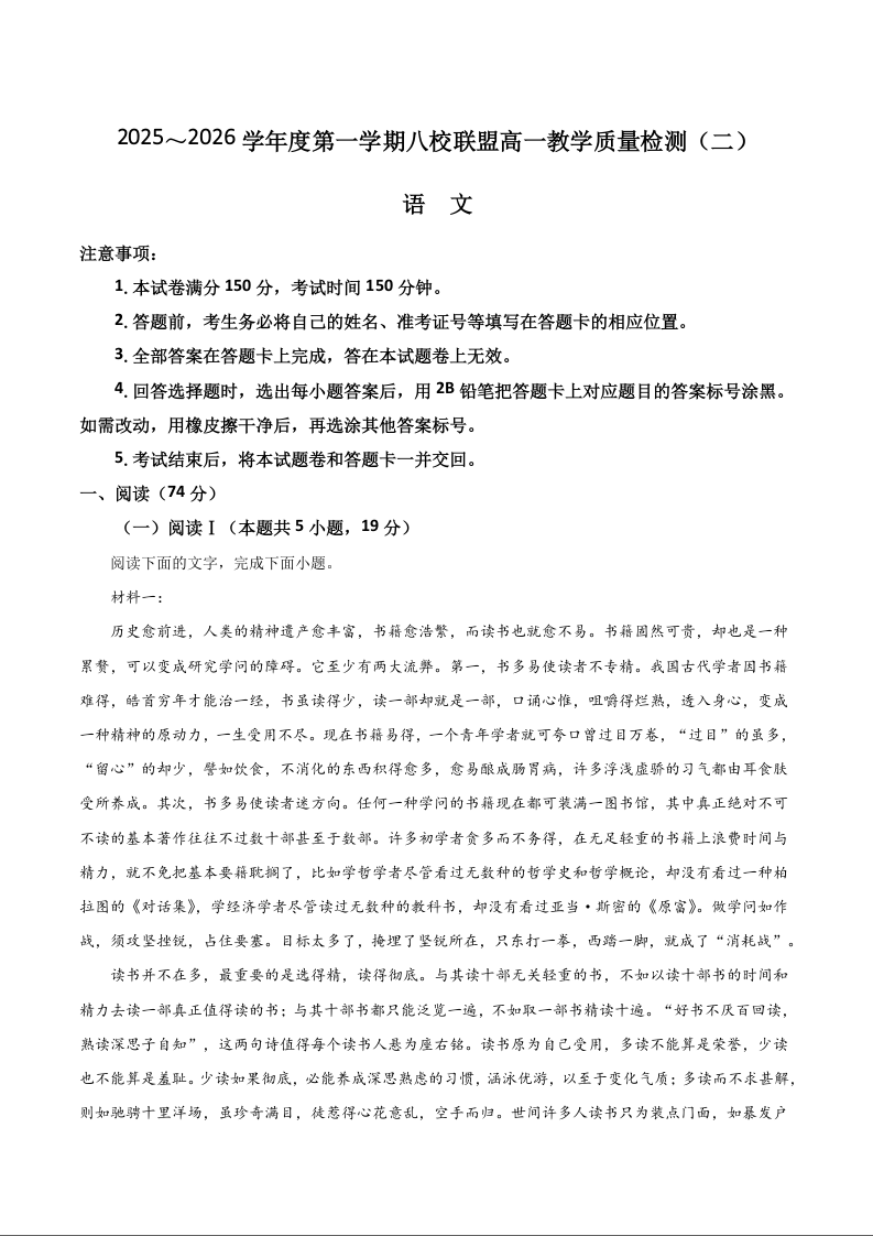 高一语文+答案--广东省八校联盟2025-2026学年高一上学期教学质量检测(二)