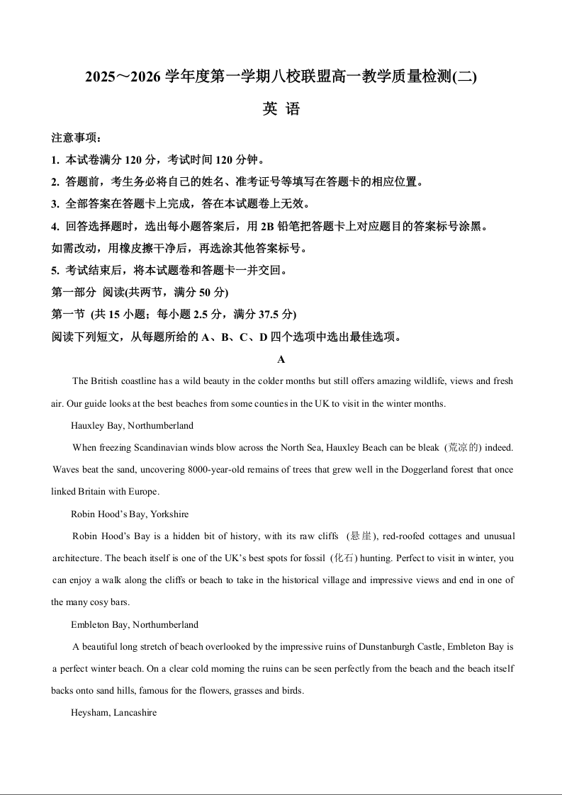 高一英语+答案--广东省八校联盟2025-2026学年高一上学期教学质量检测(二)