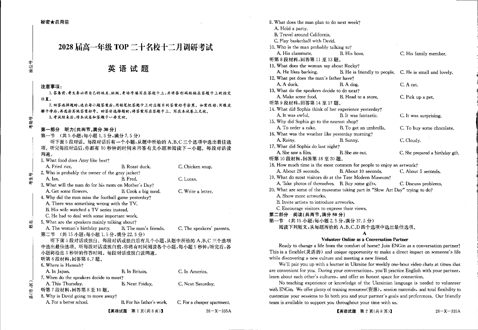 高一英语+答案--河南省TOP二十名校2025-2026学年高一上学期12月调研考试