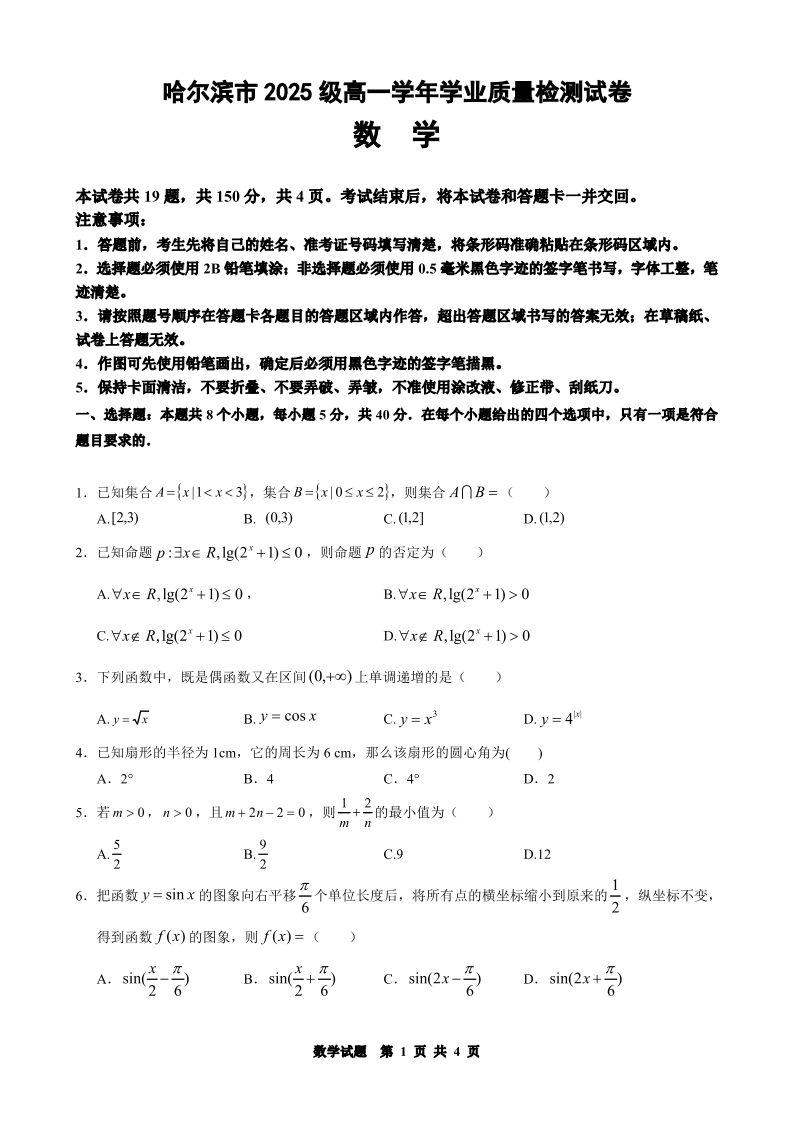 高一数学--黑龙江省哈尔滨市2025-2026学年高一上学期期末学业质量检测