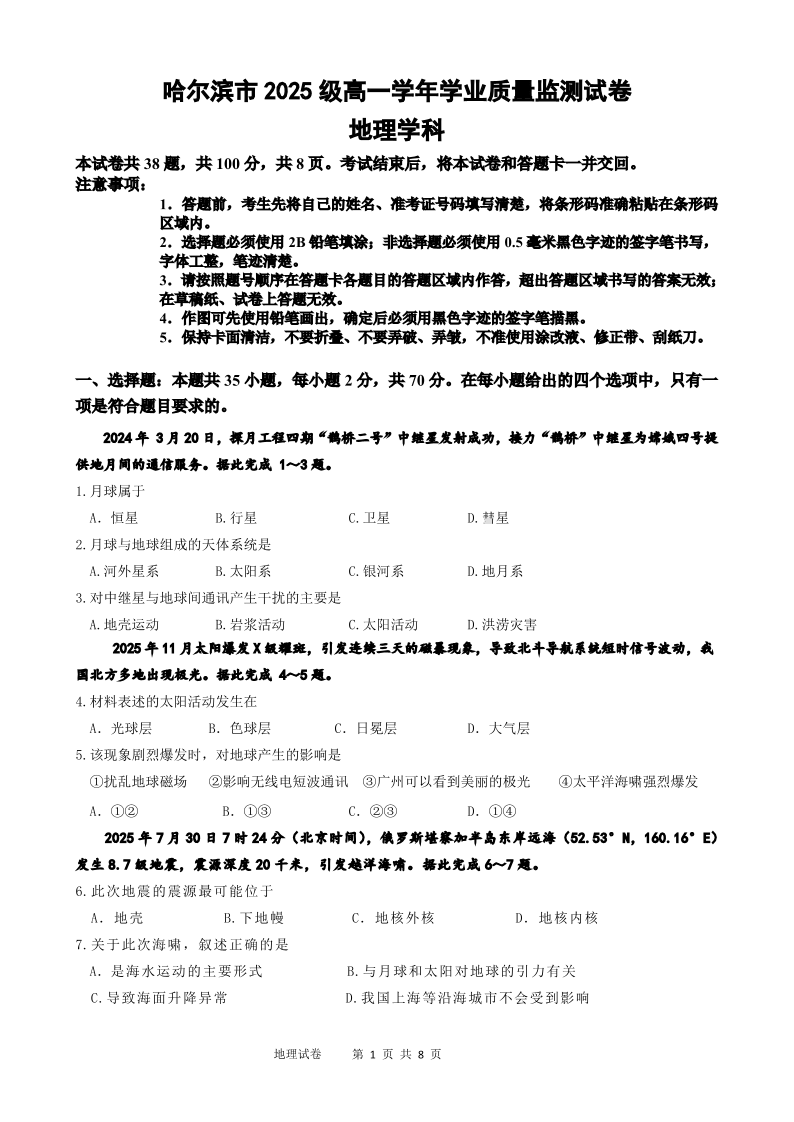 高一地理+答案--黑龙江省哈尔滨市2025-2026学年高一上学期期末学业质量检测