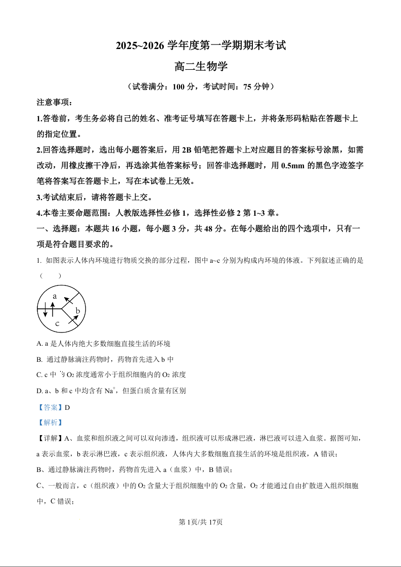 高二生物(精品解析版)--甘肃省部分学校2025-2026学年高二上学期1月期末考试
