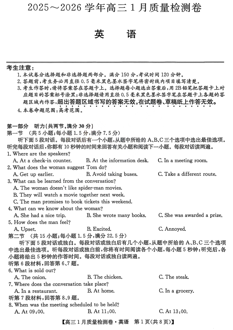 高三英语--山西三晋卓越联盟2026届高三1月质量检测