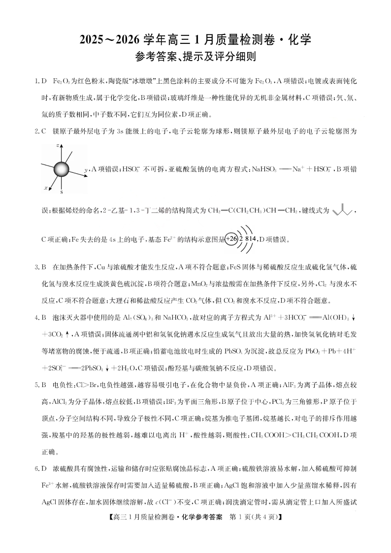 高三化学答案--山西三晋卓越联盟2026届高三1月质量检测