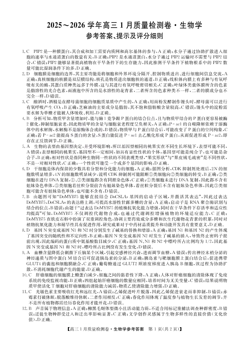 高三生物答案--山西三晋卓越联盟2026届高三1月质量检测