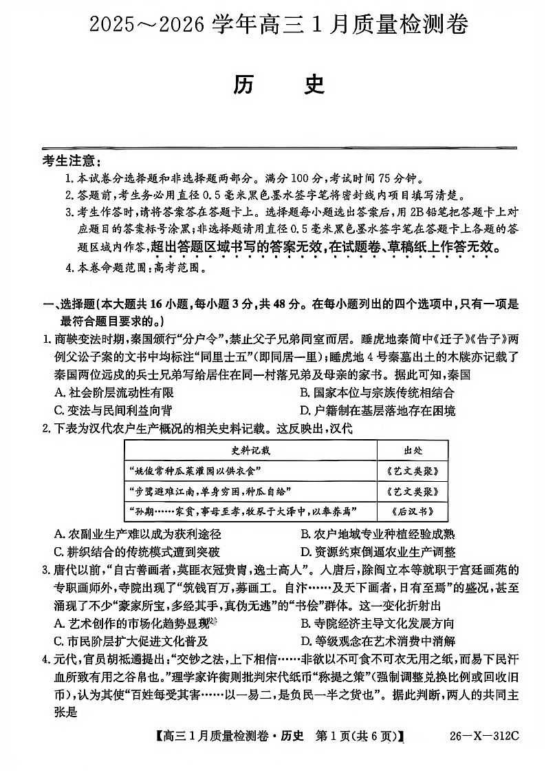 高三历史--山西三晋卓越联盟2026届高三1月质量检测
