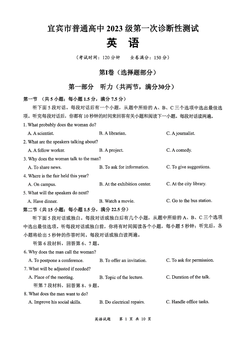 高三英语+答案--四川省宜宾市普通高中2023级(2026届)高三年级第一次诊断性测试