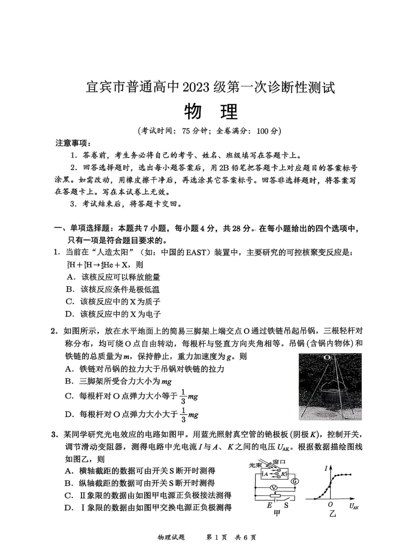 高三物理--四川省宜宾市普通高中2023级(2026届)高三年级第一次诊断性测试