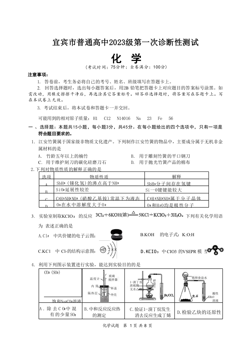 高三化学+答案--四川省宜宾市普通高中2023级(2026届)高三年级第一次诊断性测试