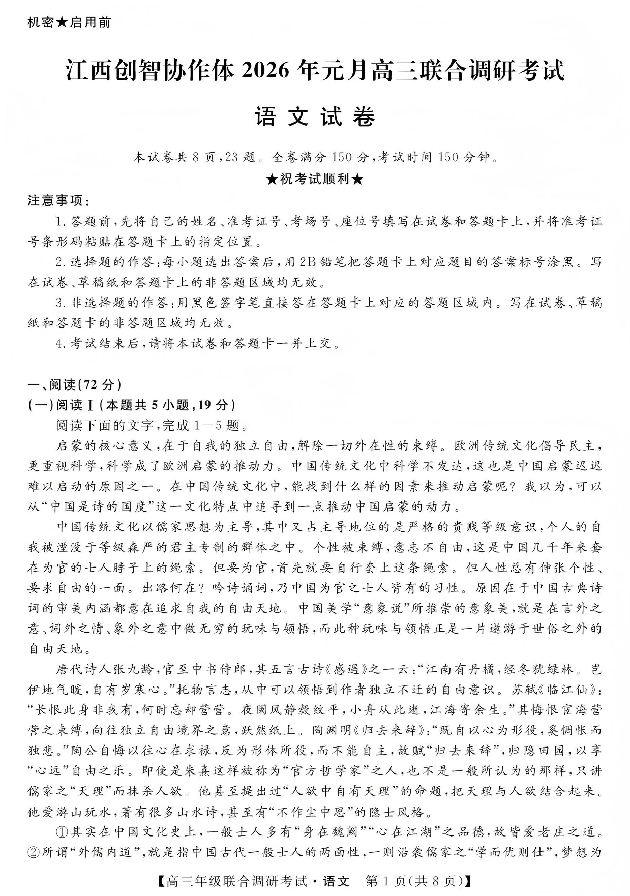 高三语文--江西创智协作体2026高三元月联合调研考试