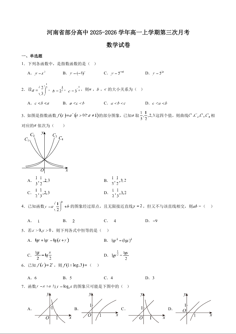 高一数学+答案--河南省部分高中2025-2026学年高一上学期第三次月考