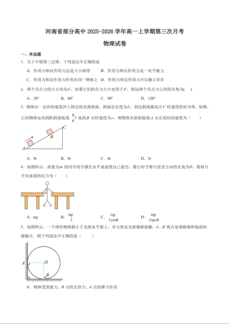 高一物理+答案--河南省部分高中2025-2026学年高一上学期第三次月考