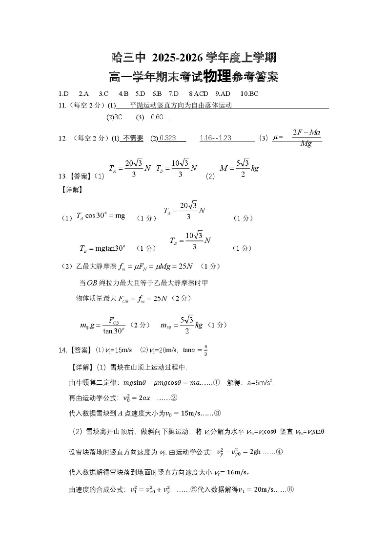 高一物理答案--黑龙江省哈尔滨市第三中学校2025-2026学年高一上学期1月期末