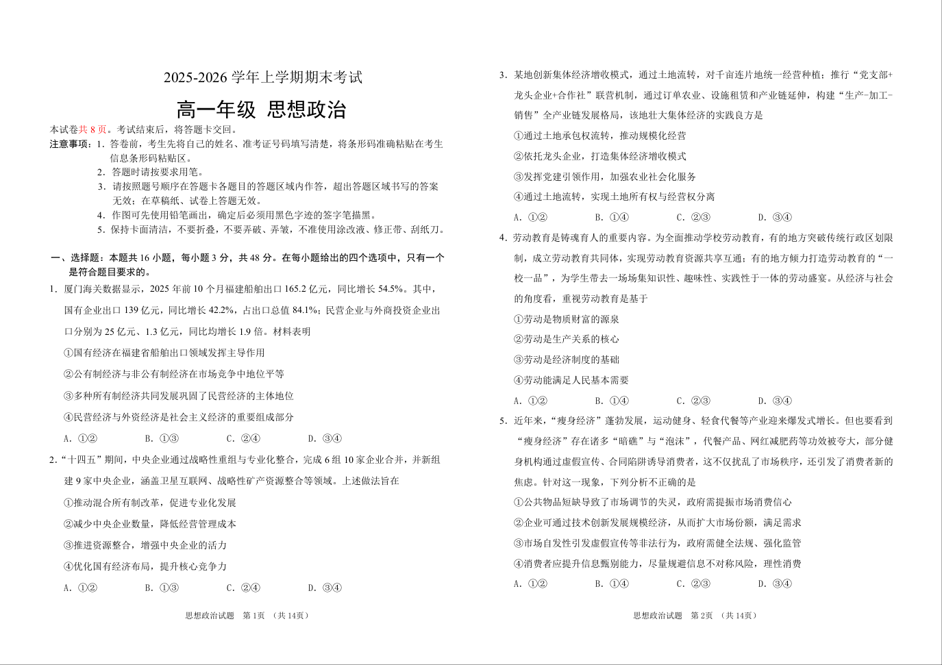 高一政治+答案--吉林省长春外国语学校2025-2026学年高一上学期期末考试