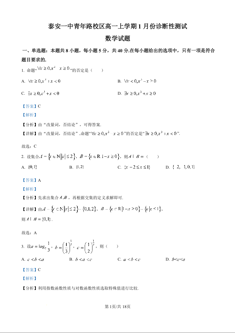 高一数学(精品解析版)--山东省泰安市第一中学(青年路校区)2025-2026学年高一上学期1月诊断性测试