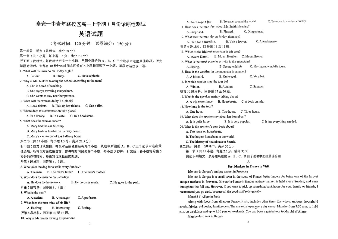 高一英语+答案--山东省泰安市第一中学(青年路校区)2025-2026学年高一上学期1月诊断性测试