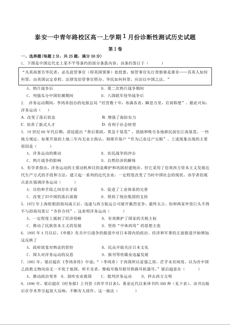 高一历史+答案--山东省泰安市第一中学(青年路校区)2025-2026学年高一上学期1月诊断性测试