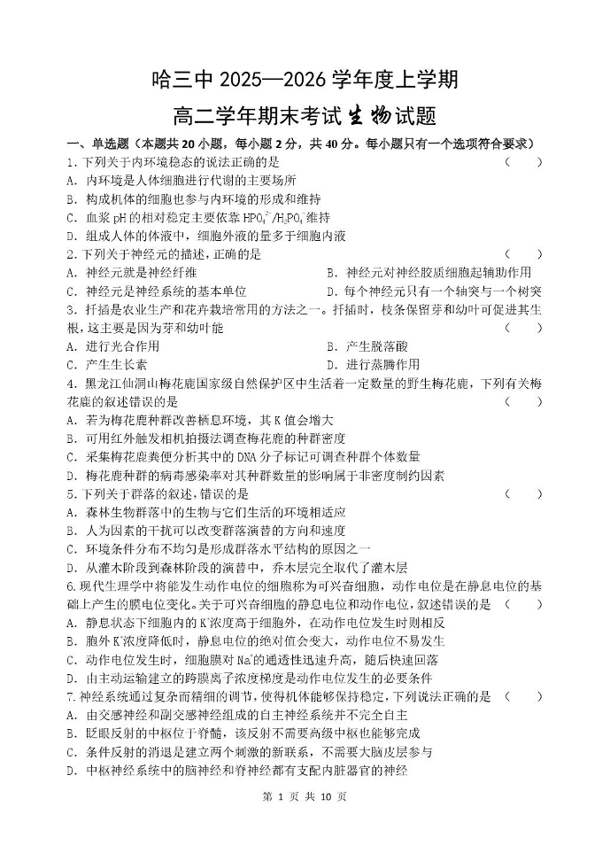 高二生物--黑龙江省哈尔滨市第三中学校2025-2026学年高二上学期1月期末