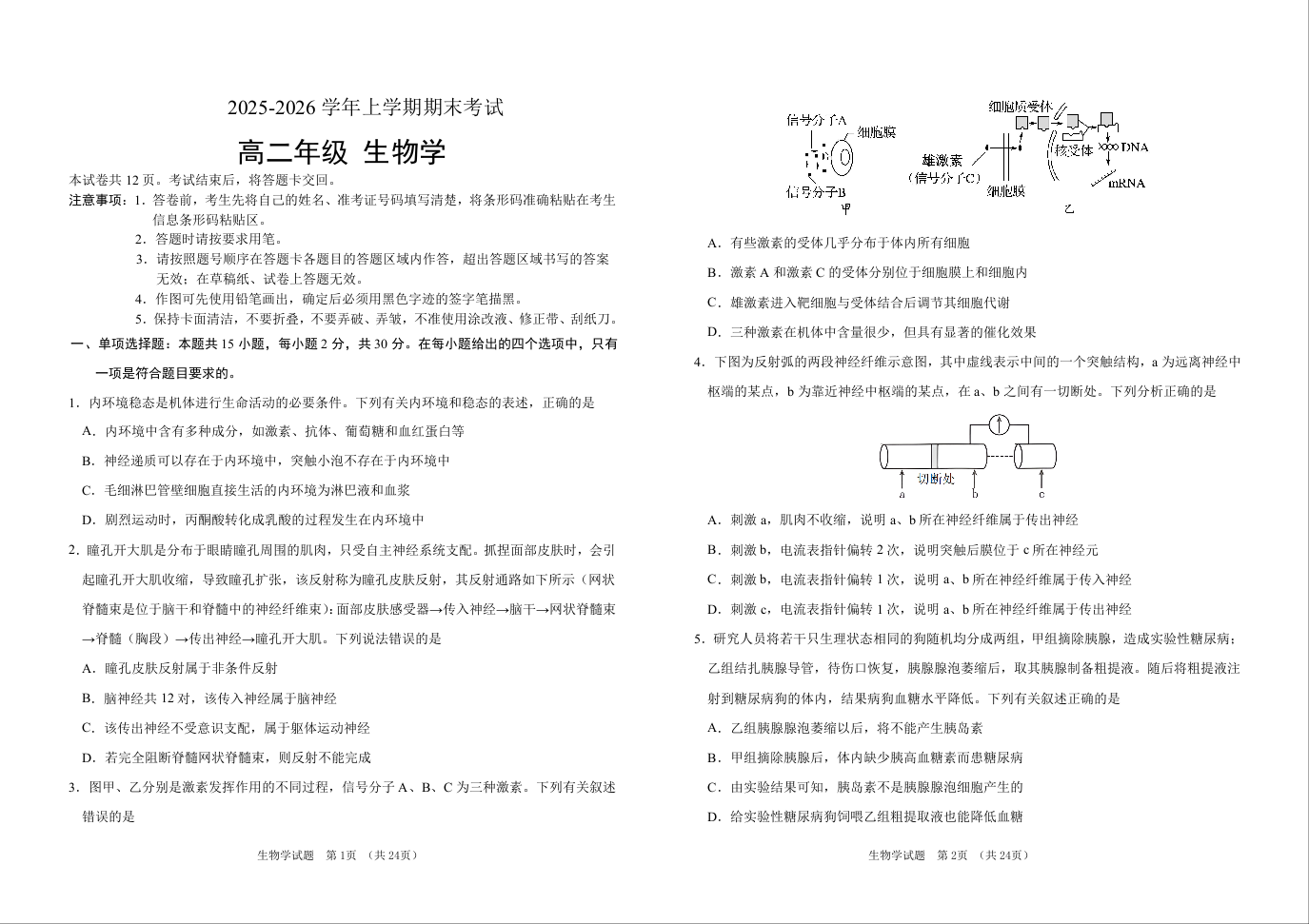 高二生物+答案--吉林省长春外国语学校2025-2026学年高二上学期期末考试