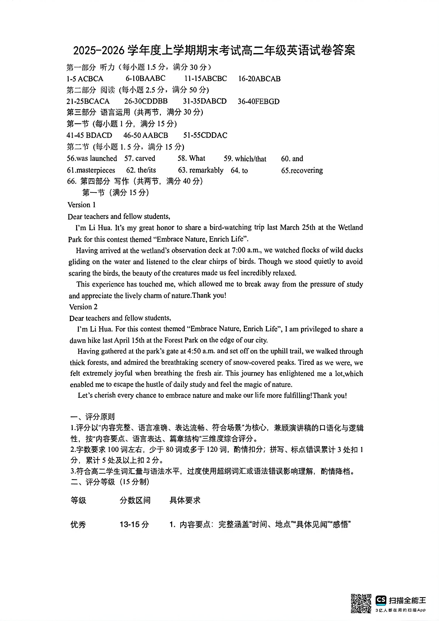高二英语答案--辽宁省五校联盟2025-2026学年高二上学期期末考试