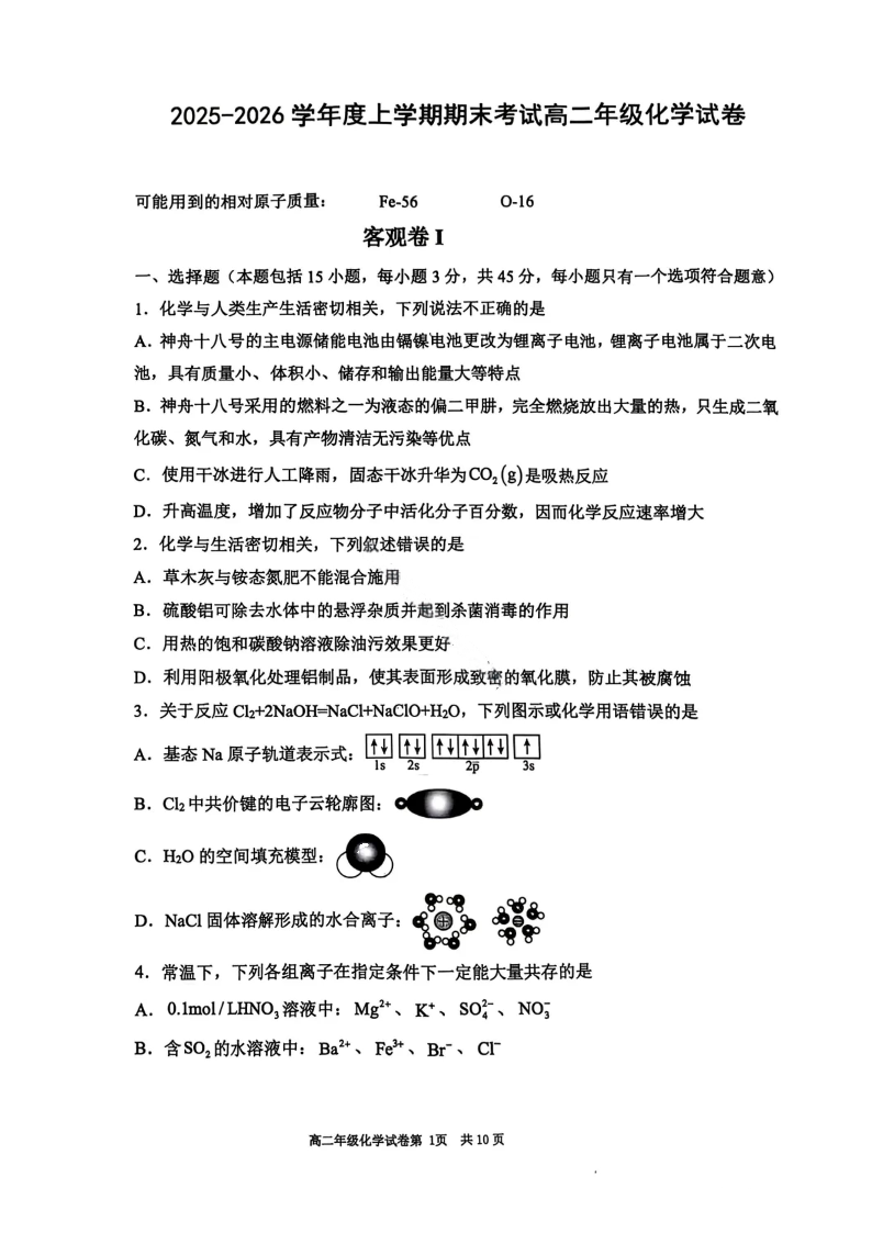 高二化学--辽宁省五校联盟2025-2026学年高二上学期期末考试