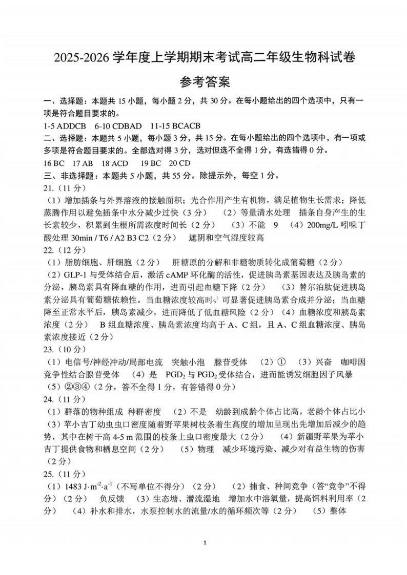 高二生物答案--辽宁省五校联盟2025-2026学年高二上学期期末考试