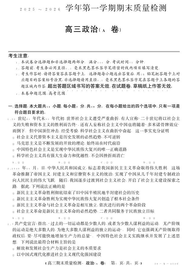 高三政治A--安徽省县域合作共享联盟2026届高三上学期1月期末质量检测