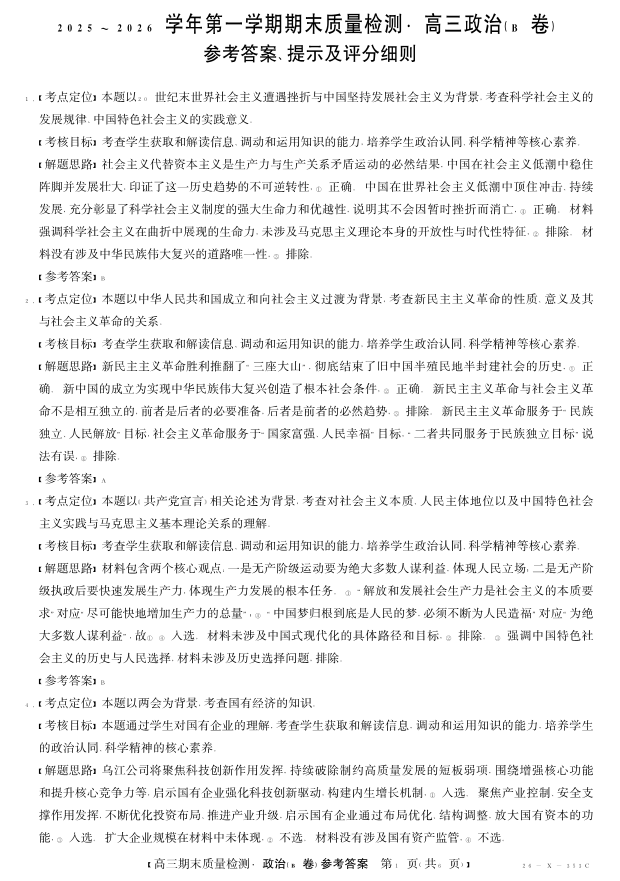 高三政治B答案--安徽省县域合作共享联盟2026届高三上学期1月期末质量检测