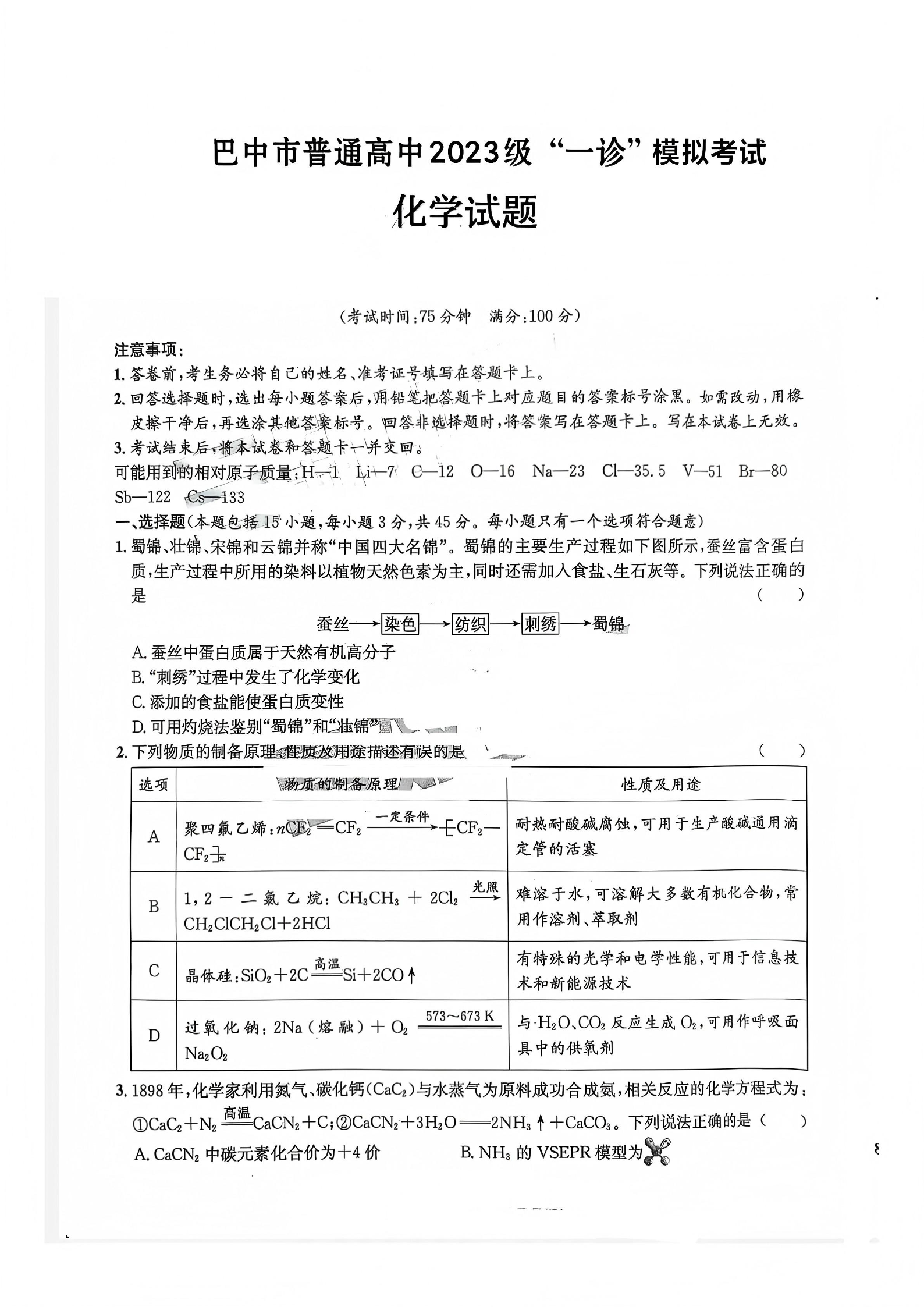 高三化学--四川省巴中市普通高中2023级“一诊”模拟考试