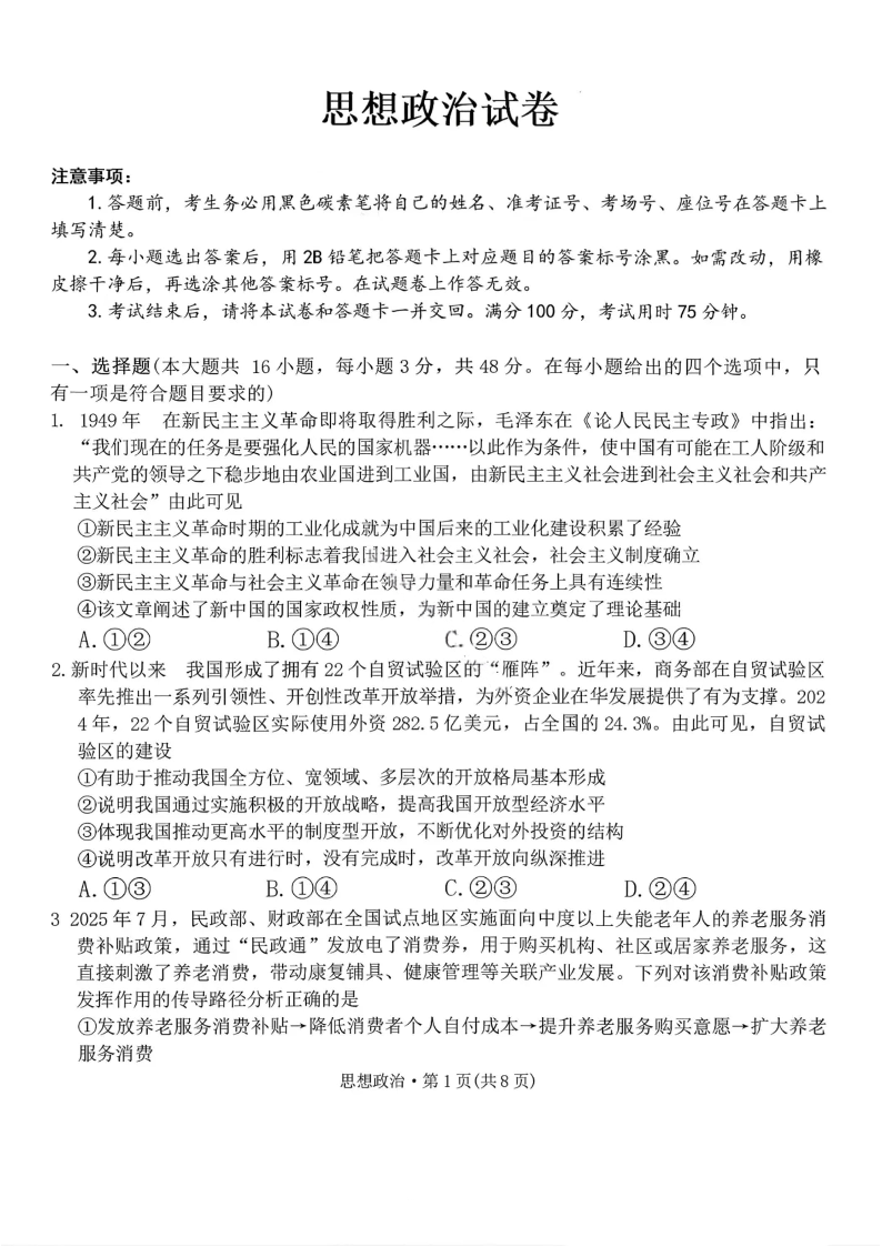 高三政治答案--云南师大附中2026届高三1月高考适应性月考卷(六)