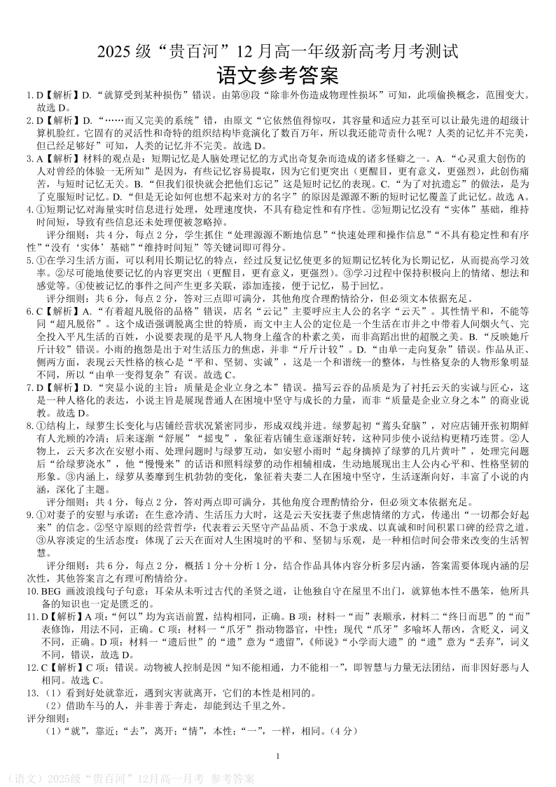 高一语文答案-- 广西贵百河2025-2026学年高一上学期12月新高考月考测试
