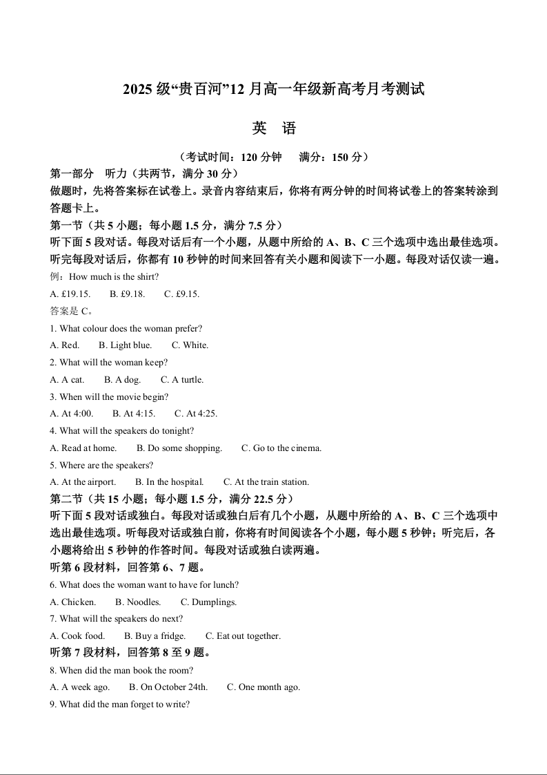 高一英语+答案-- 广西贵百河2025-2026学年高一上学期12月新高考月考测试