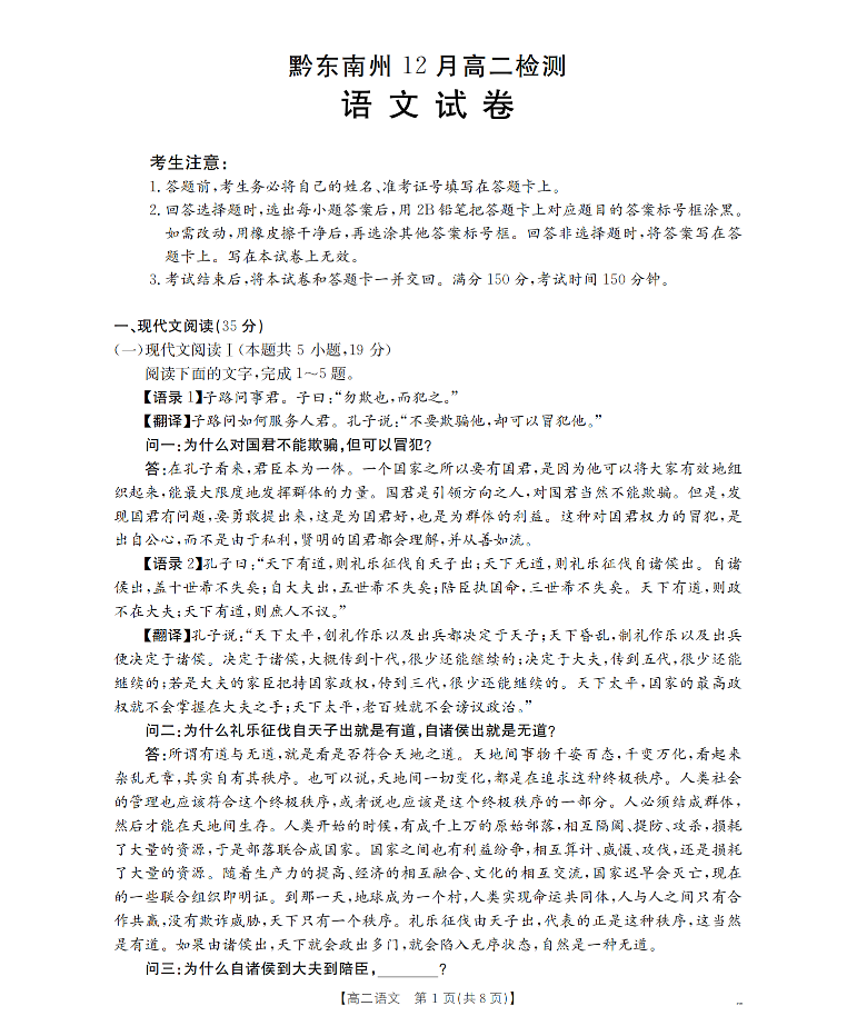 高二语文--贵州省黔东南州2025-2026学年高二上学期12月检测试卷