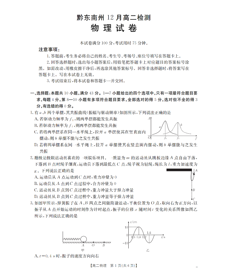 高二物理--贵州省黔东南州2025-2026学年高二上学期12月检测试卷