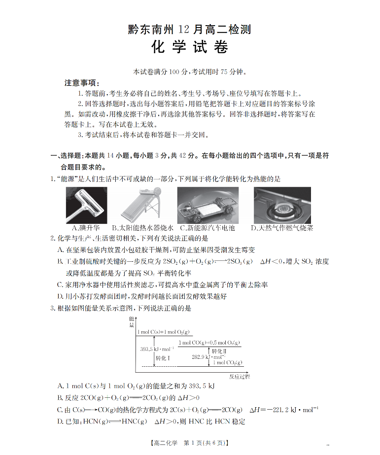 高二化学--贵州省黔东南州2025-2026学年高二上学期12月检测试卷