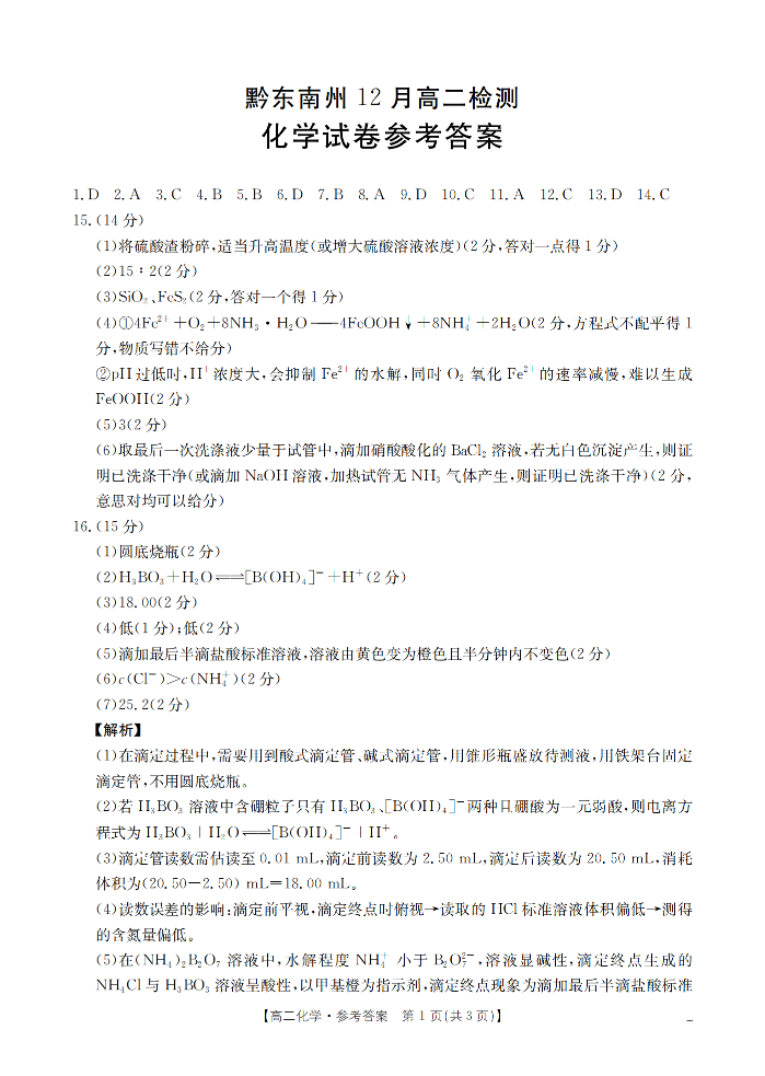 高二化学答案--贵州省黔东南州2025-2026学年高二上学期12月检测试卷