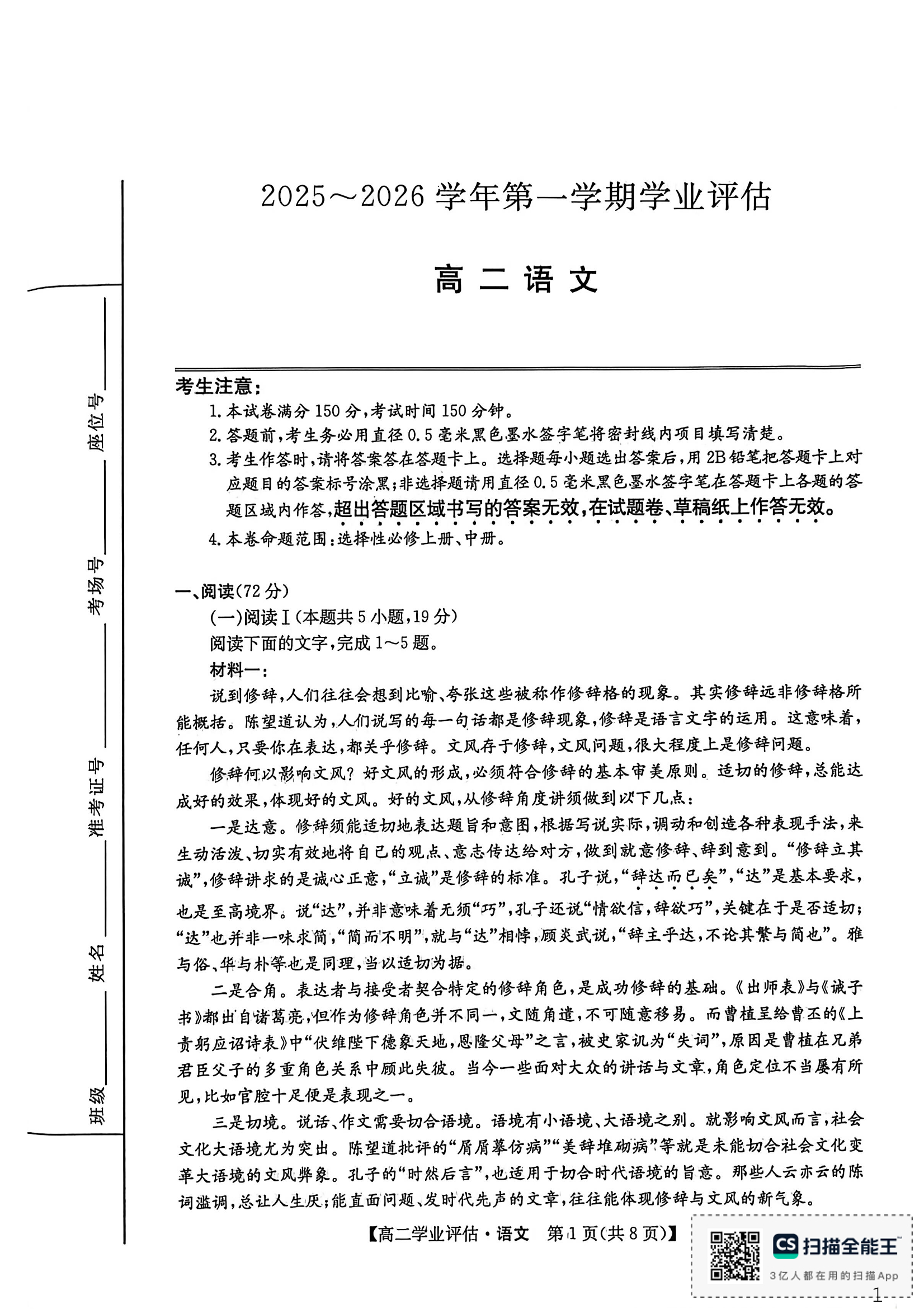 高二语文--河北省2025-2026学年高二第一学期学业评估
