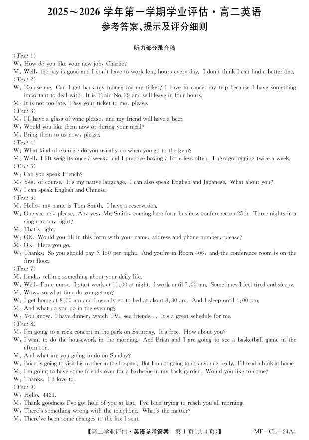 高二英语答案--河北省2025-2026学年高二第一学期学业评估