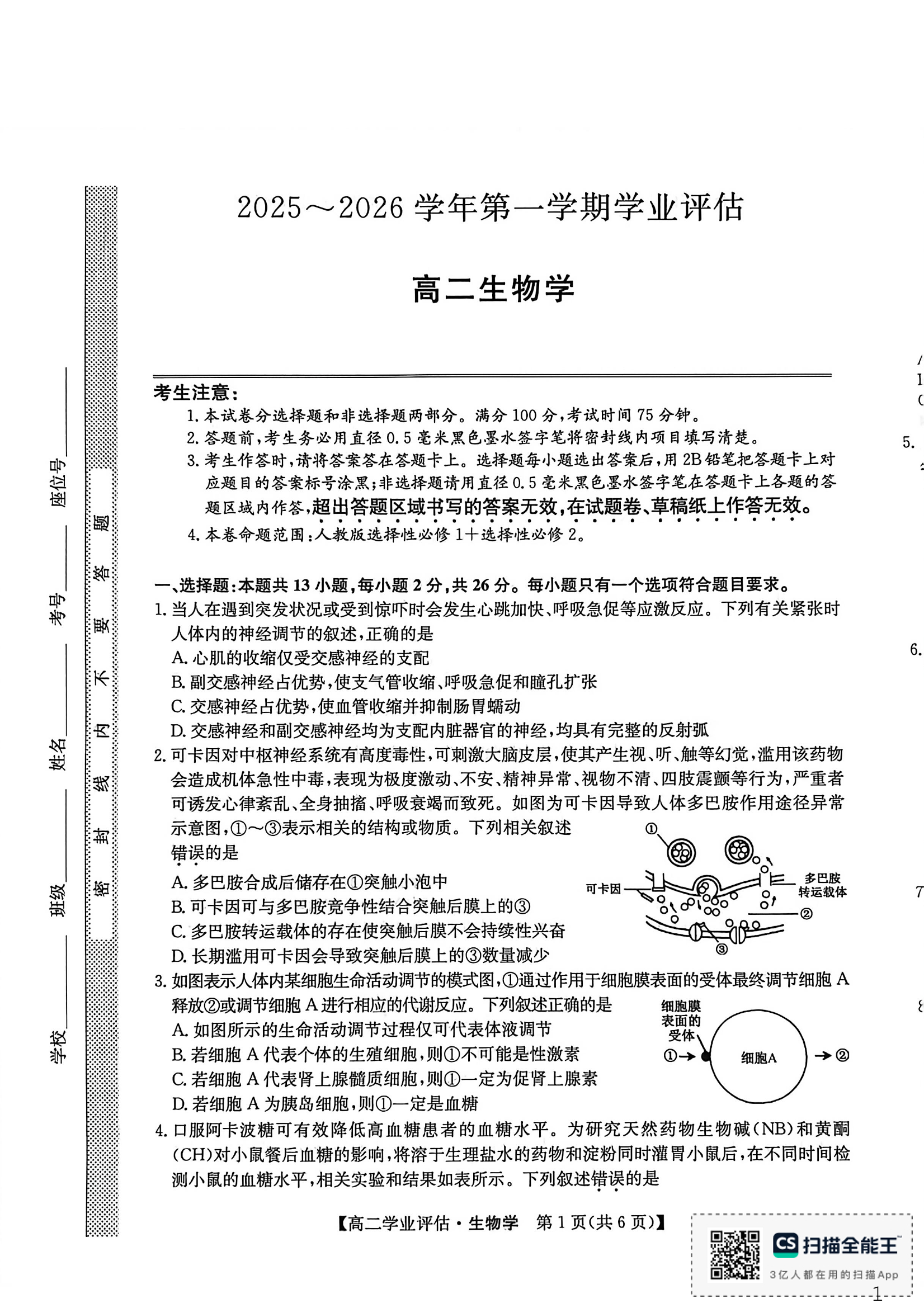 高二生物--河北省2025-2026学年高二第一学期学业评估