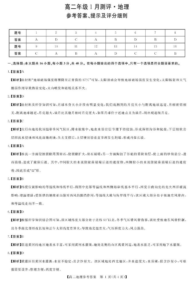 高二地理答案--河南省周口市重点高中2025-2026学年高二上学期1月月考