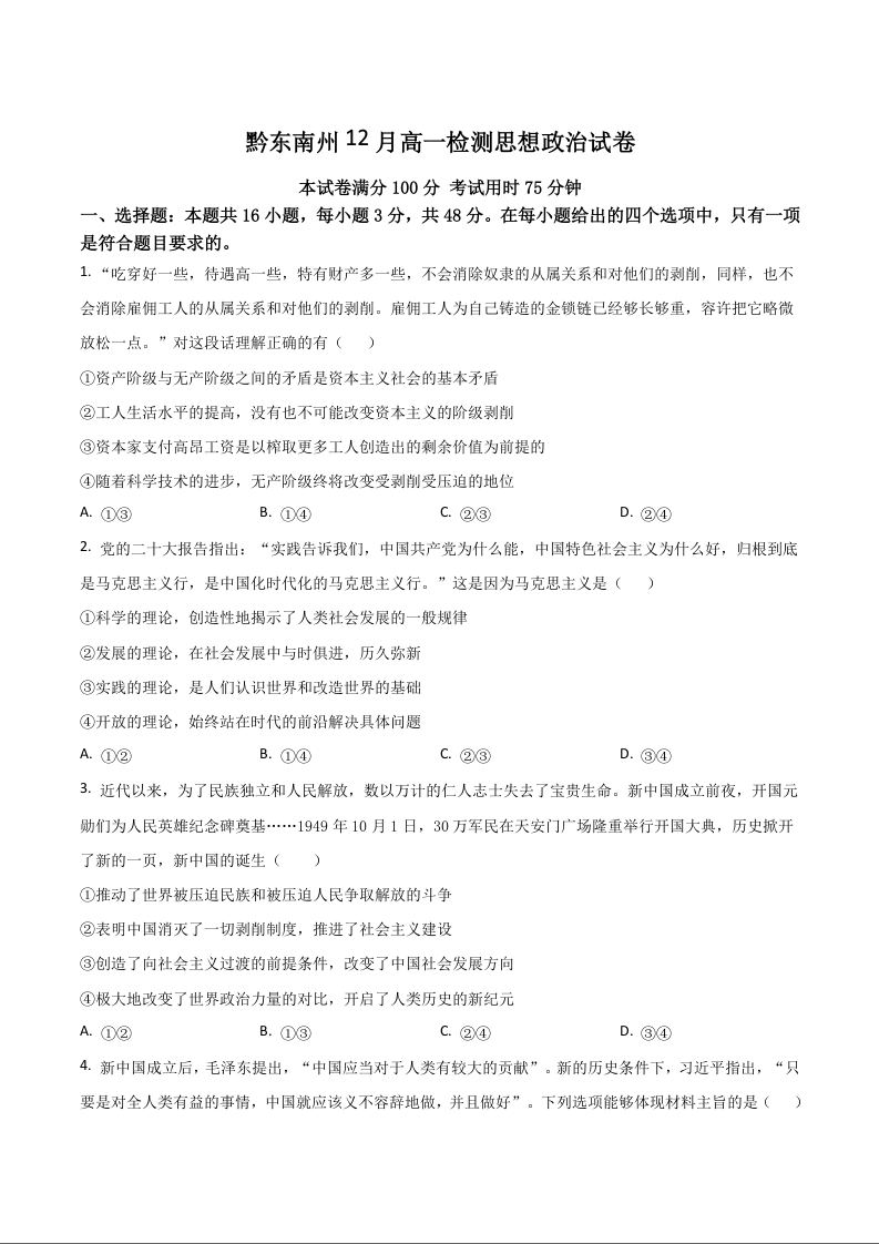 高一政治+答案--贵州省黔东南州2025-2026学年高一上学期12月检测试卷