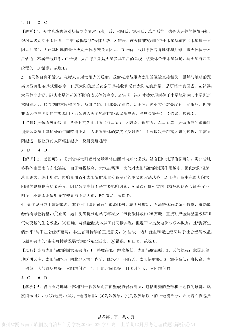 高一地理(解析版)--贵州省黔东南州2025-2026学年高一上学期12月检测试卷